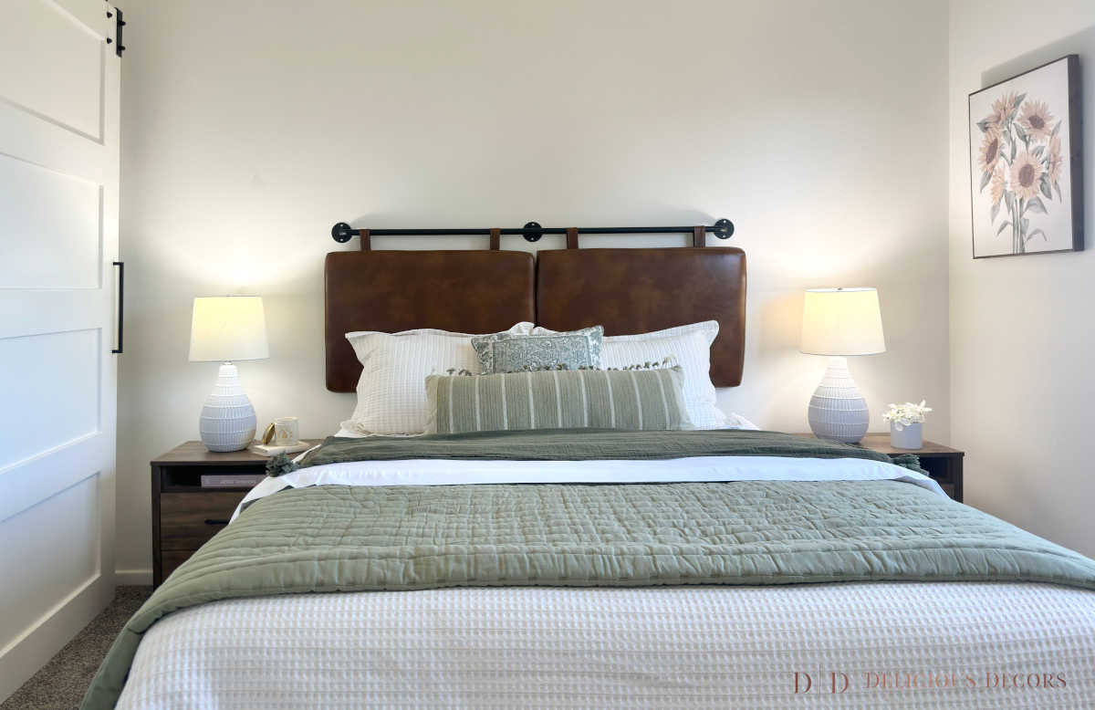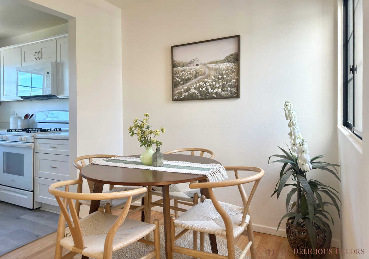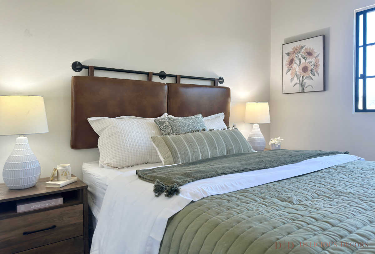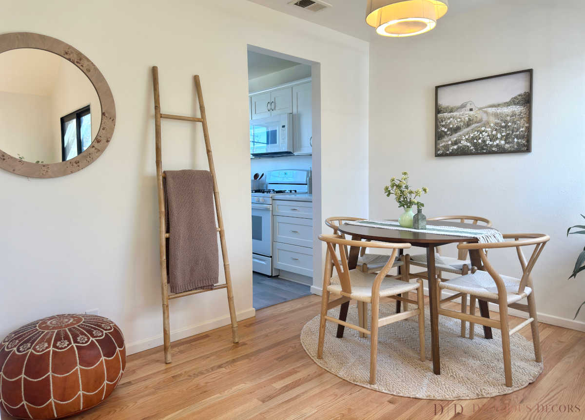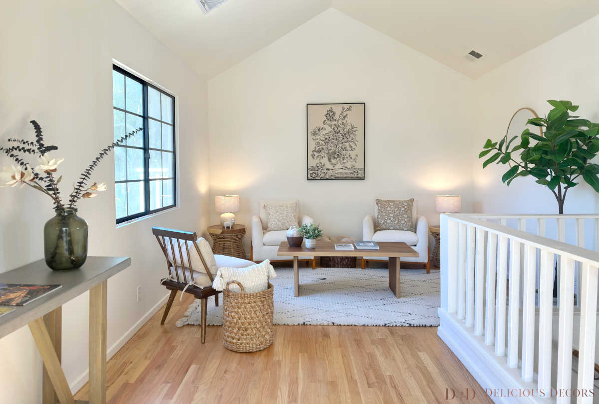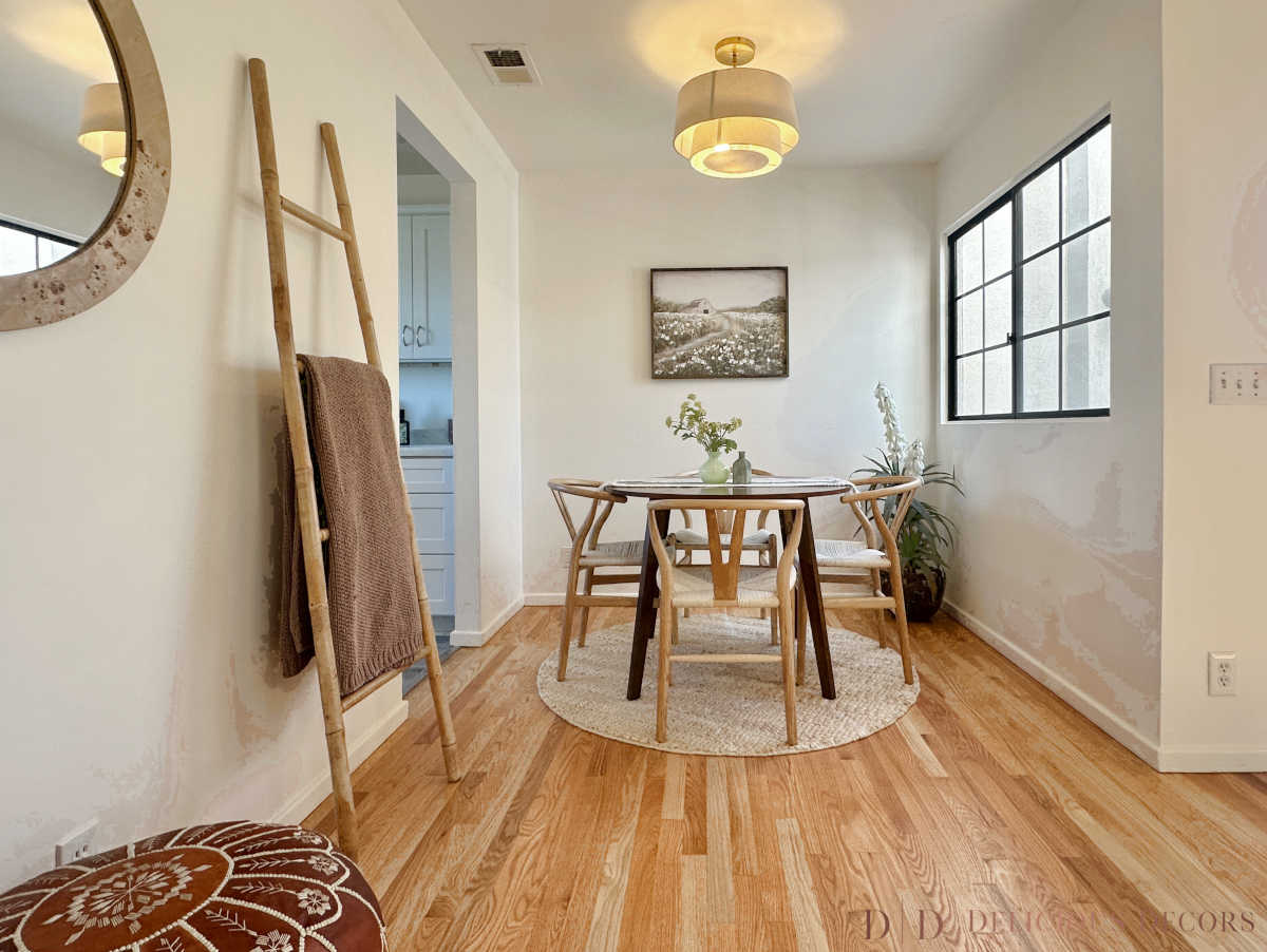 To accentuate this space, our Solvang townhouse home staging embraces a Danish Modern aesthetic, layering contemporary silhouettes with rustic, soulful textures. In the primary suite, a trend-setting cognac leather headboard and sage linens are softened by the intricate filigree of the bedside lamps. This countryside charm carries into the living area, where a vintage botanical sketch and traditional block-print pillows provide a sophisticated, organic contrast to the plush bouclé armchairs.
