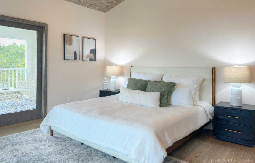 Our Modern Farmhouse luxury staging design echoes this blend of old and new. Plush velvet seating in a rich, blue-toned grey provides a modern counterpoint to the rustic wood and stone. The clean lines of the modular sofa, with its casually placed pillows, add a contemporary edge, inviting relaxation and conversation. A statement coffee table with cane siding introduces organic texture, playing off the charm of nearby ash & walnut pedestal end tables.